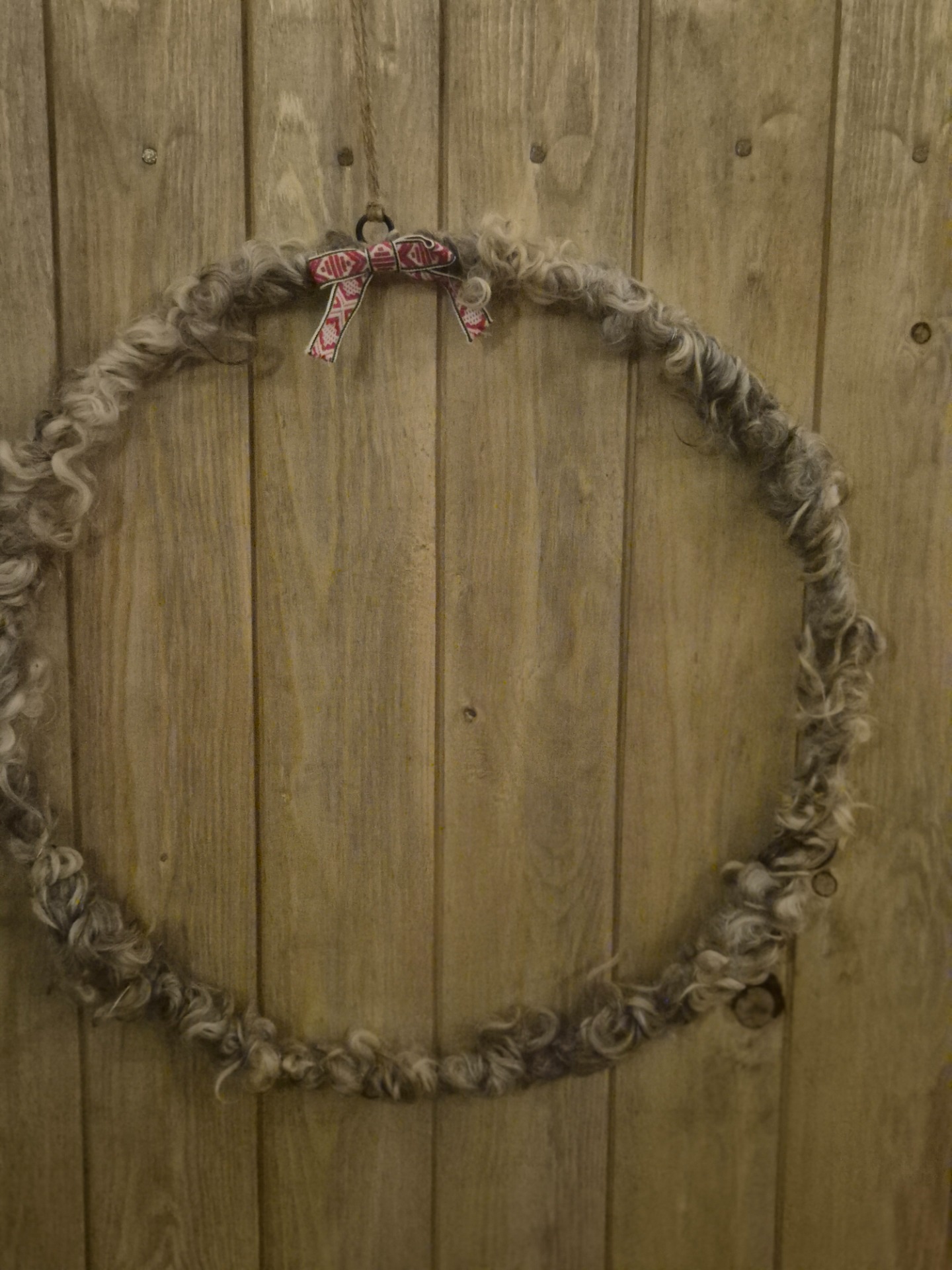 Större ullkrans på en svart stålkrans. Tröttnar man på ullen är det bara att klä av kransen och använda den till något annat.