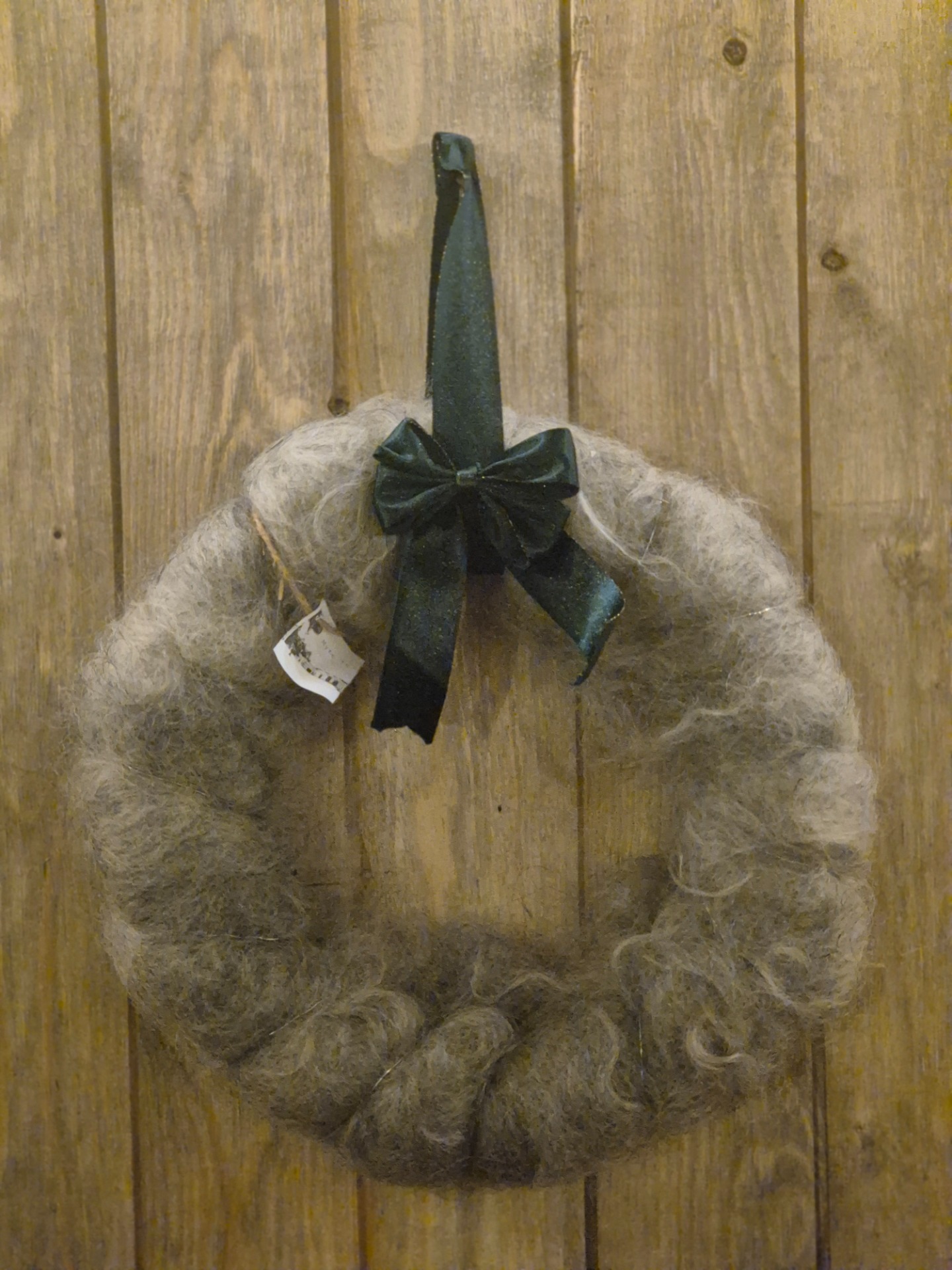 Ullkrans med halmstomme, kardad ull och grön rosett.